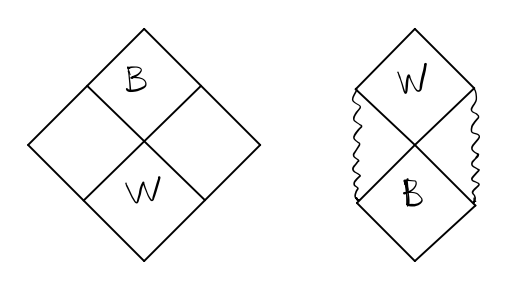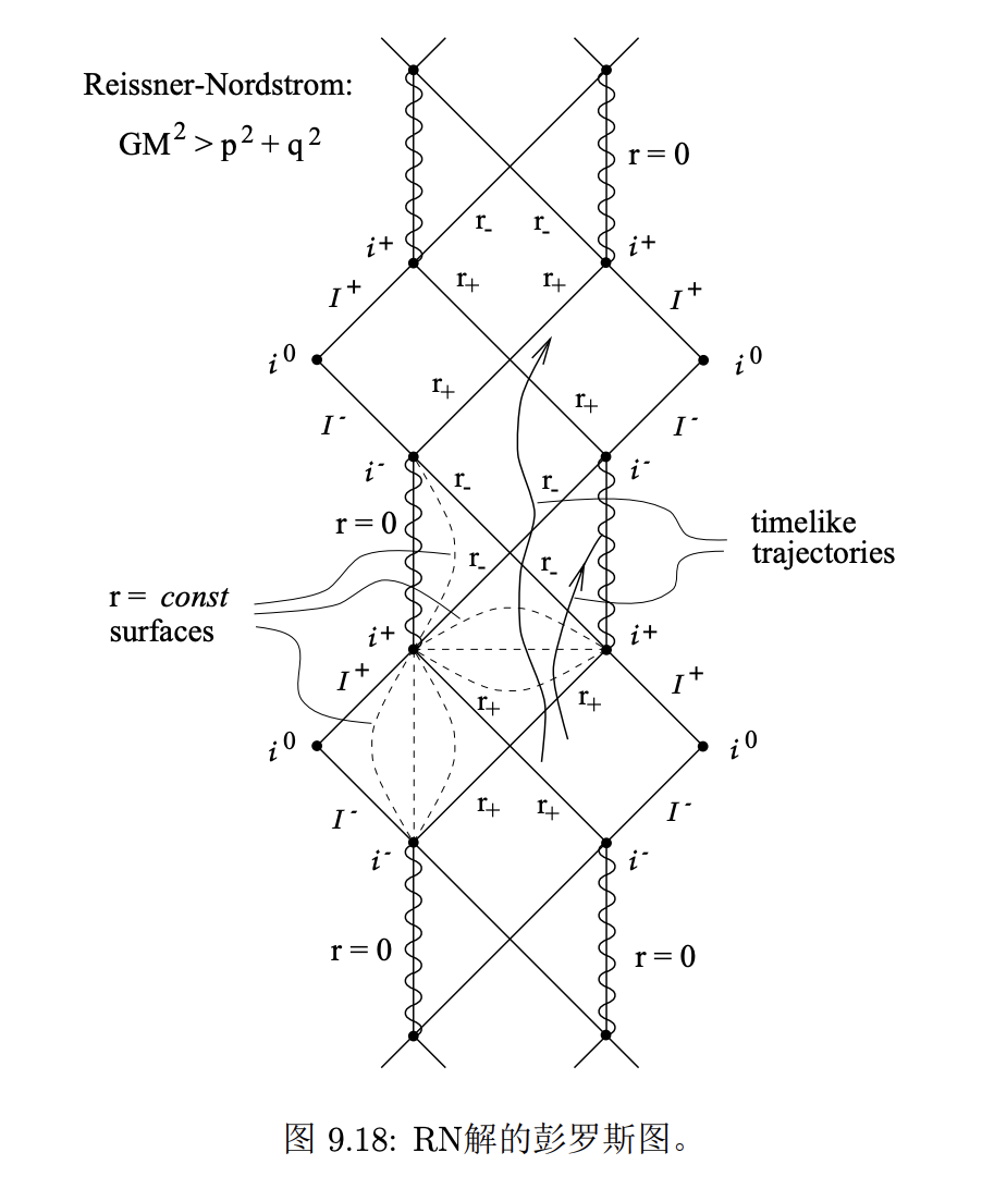 和 Schwarzschild 时空的 Kruskal 坐标相比,那里的 r=0 对应着 uv=1 的双曲线;但是这里 r=0 对应 u−v−=−1,因此进入的类时世界线不一定会碰到 r=0 的本性奇点,而是可能回到 r+ 所对应的那个坐标. 如果是在 r+ 对应的坐标里,外部和 Schwarzschild 时空差不多,只是不存在本性奇点,只有一个虚拟的 boundary. 过了虚拟 boundary 就进入 r− 对应的坐标.