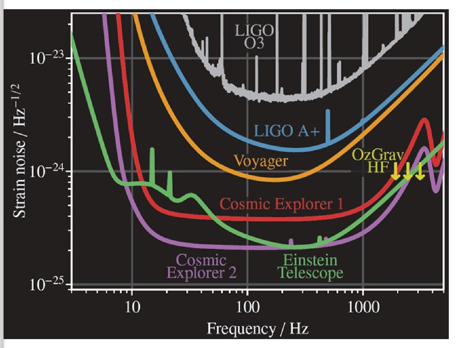 下一代探测器已经在建设过程之中,它们的 Strain Noise 处理能力和 Frequency 都得到了更大幅度的提升,目前的探测器能够测量的红移不到 1,下一代探测器能够提升到 z=10 以上的遥远宇宙,我们或许在更下一代的探测器出现时已经能够看到宇宙中所有的黑洞和中子星.