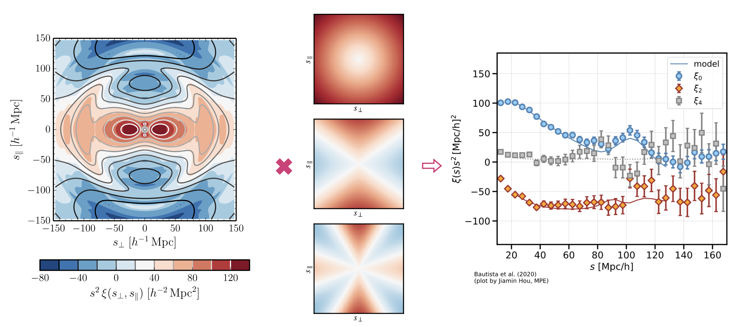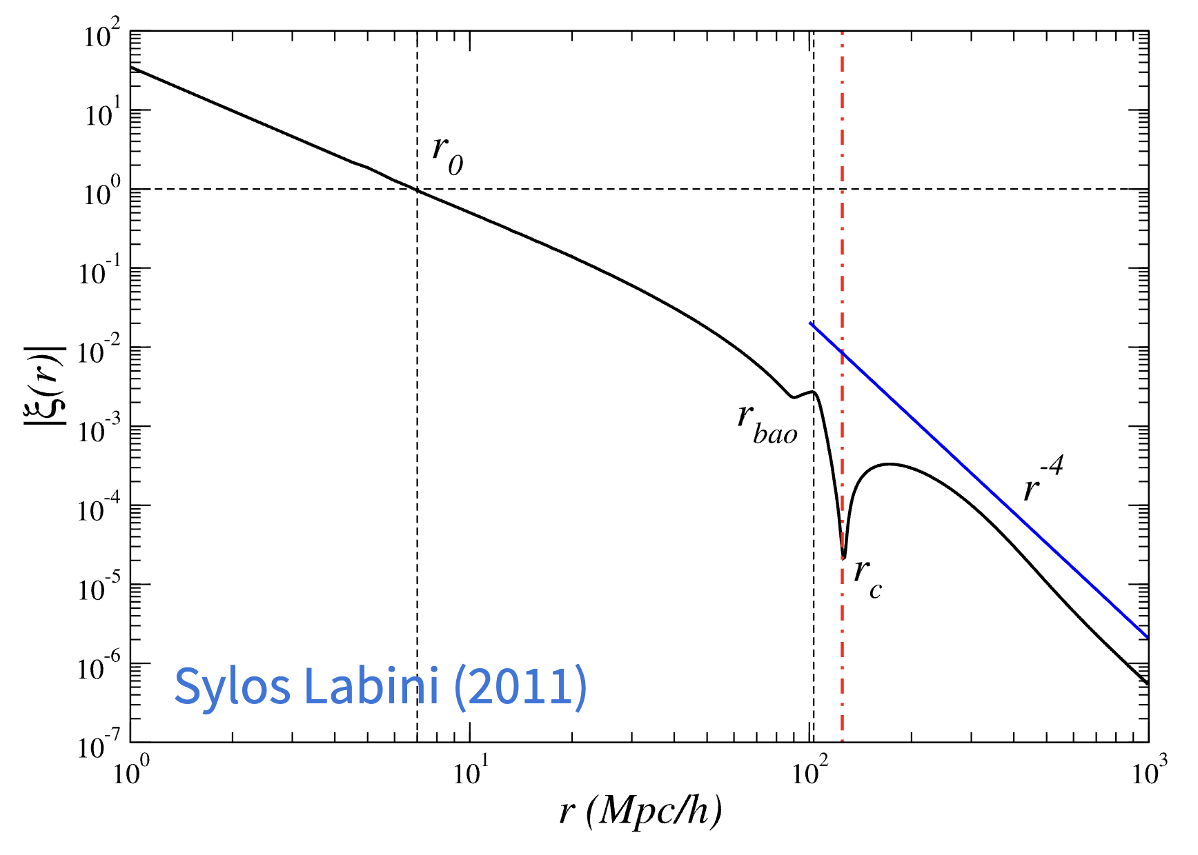 下图就是我们宇宙中关联函数的样子:在小尺度和大尺度呈现出两种不同 index 的幂律,中间的尖峰正是 BAO (重子声学振荡).