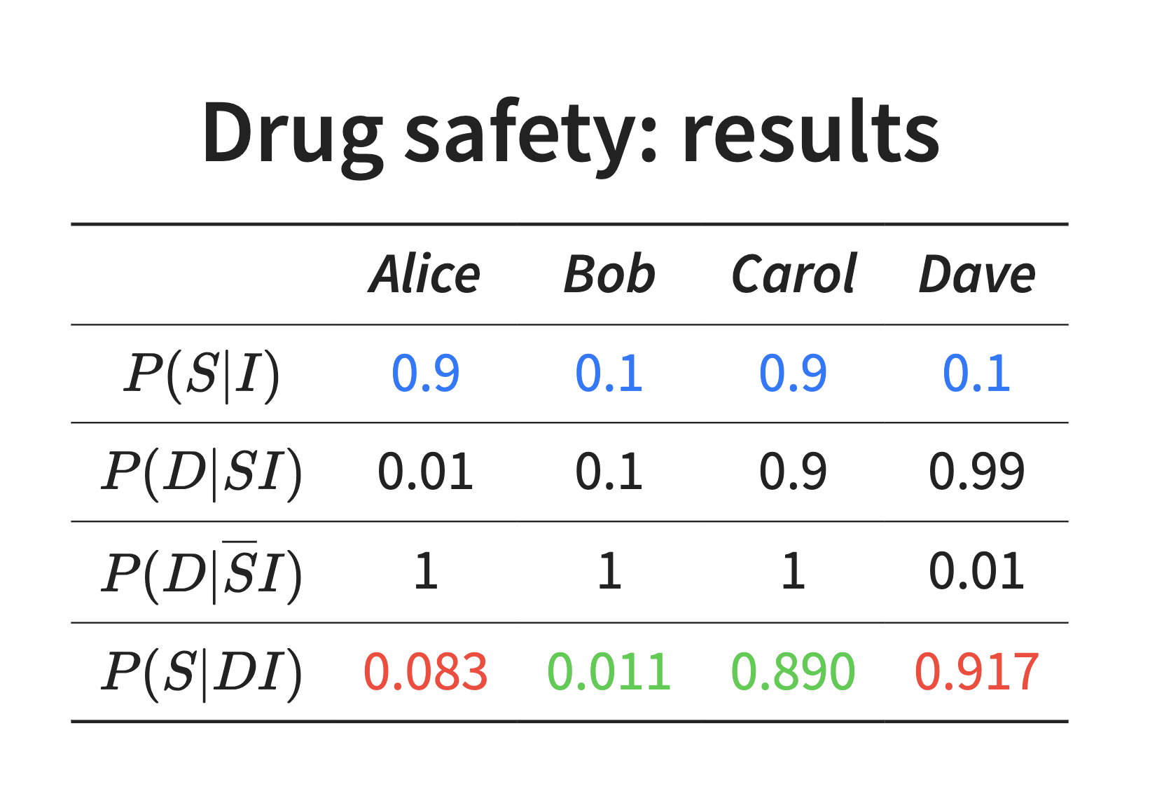 - Alice 和 Carol 认为药物安全,P(S∣I)=0.9.
