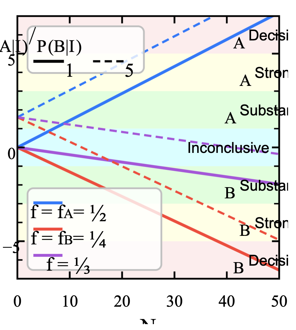 推广一些,我们可以对任意的两个假设做后验比,来选择正确的假说. 一般我们使用的是 log10OH 或者 lnOH 来判断,这是因为人类的判断,或者说感觉,很多时候是对数的.