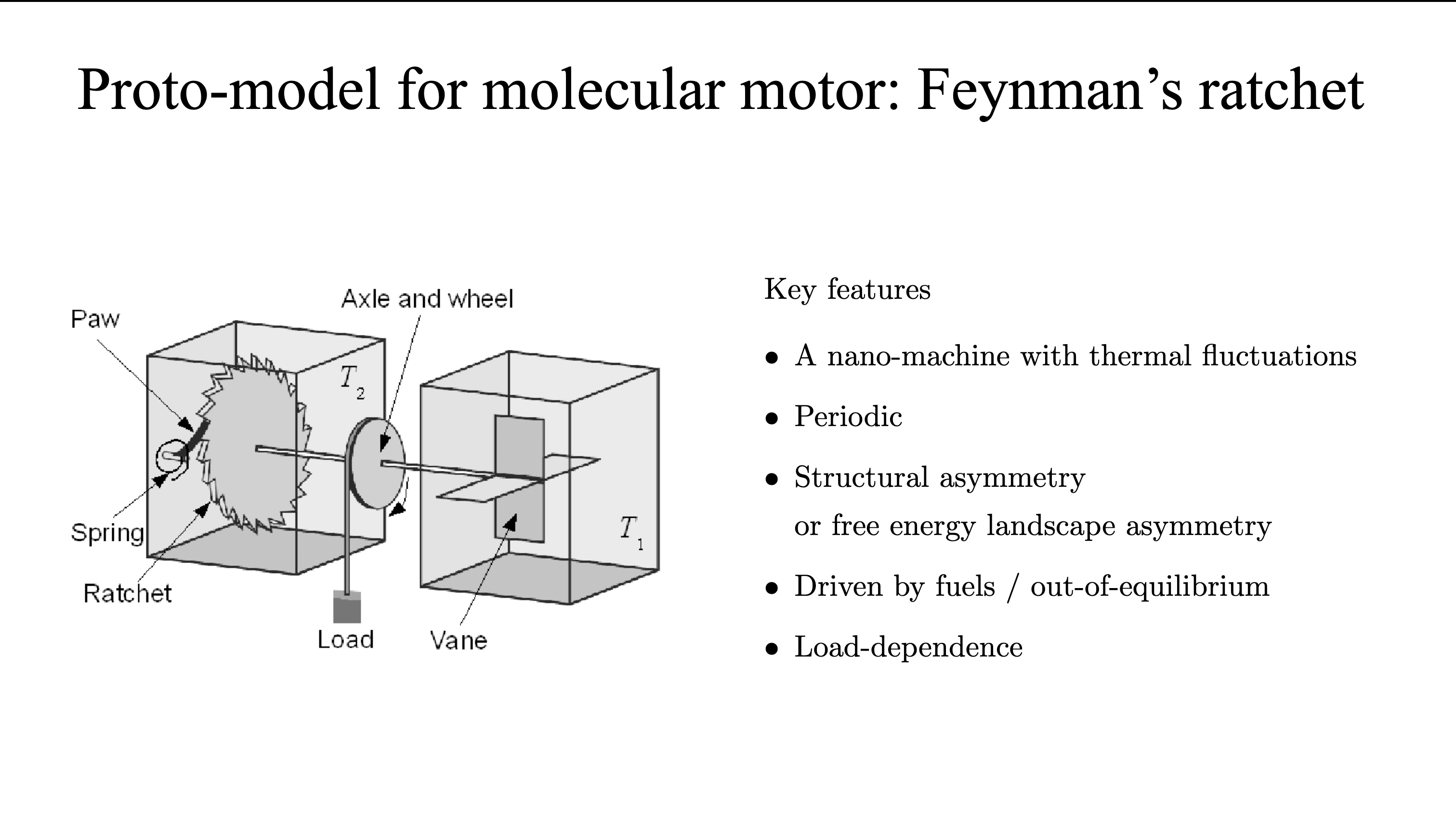 但是这产生了分子马达的原型 —— 做功的效应是涨落而不是棘轮本身,那么 ATP 是否也不是做功的能量来源、而是阻止分子马达因为涨落而回退的「棘轮」?同时,Feynman 棘轮要想正常工作,两边温度应该要有差异,也就是存在低温热源和高温热源,这也是分子马达的作用基础.