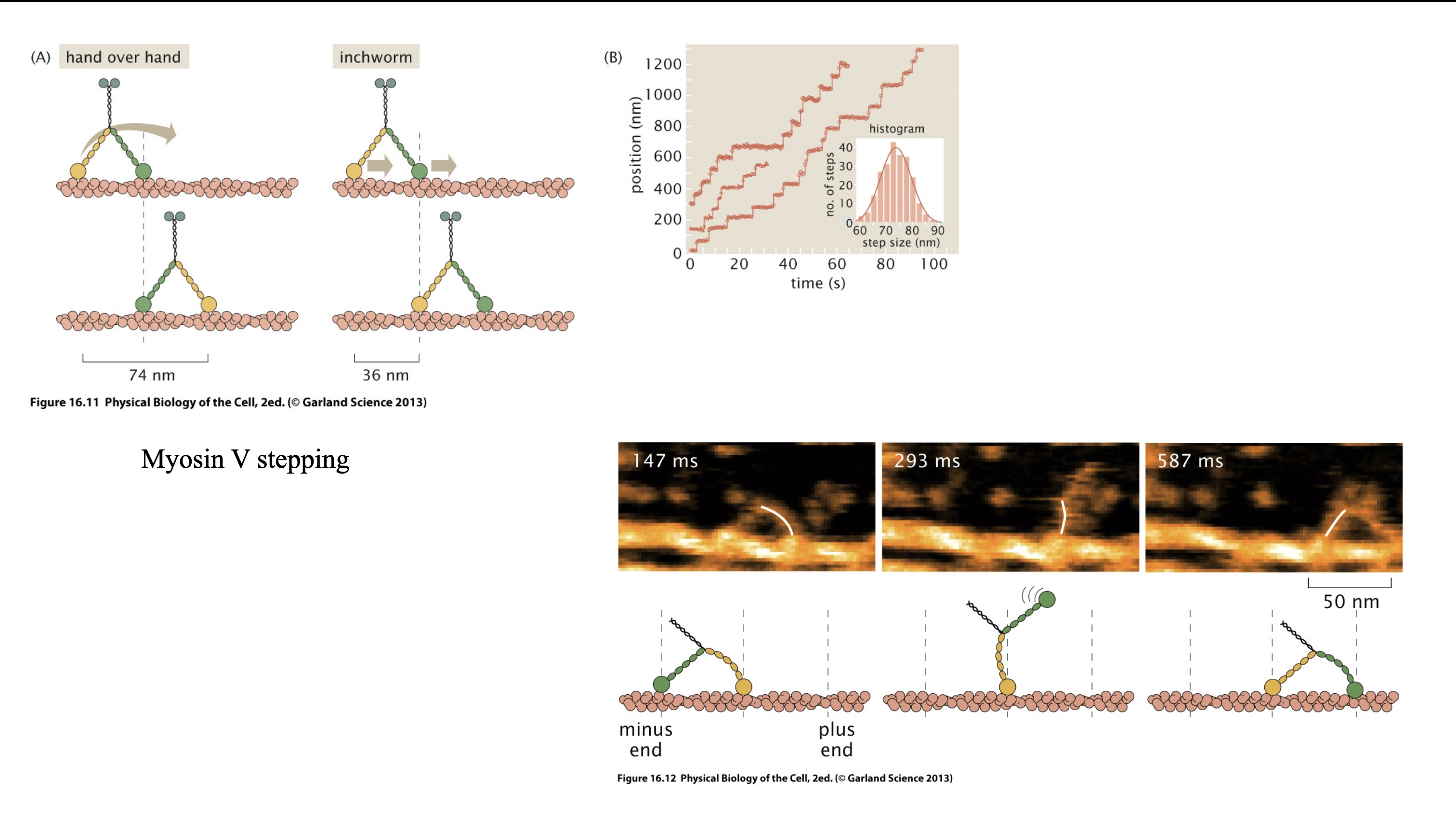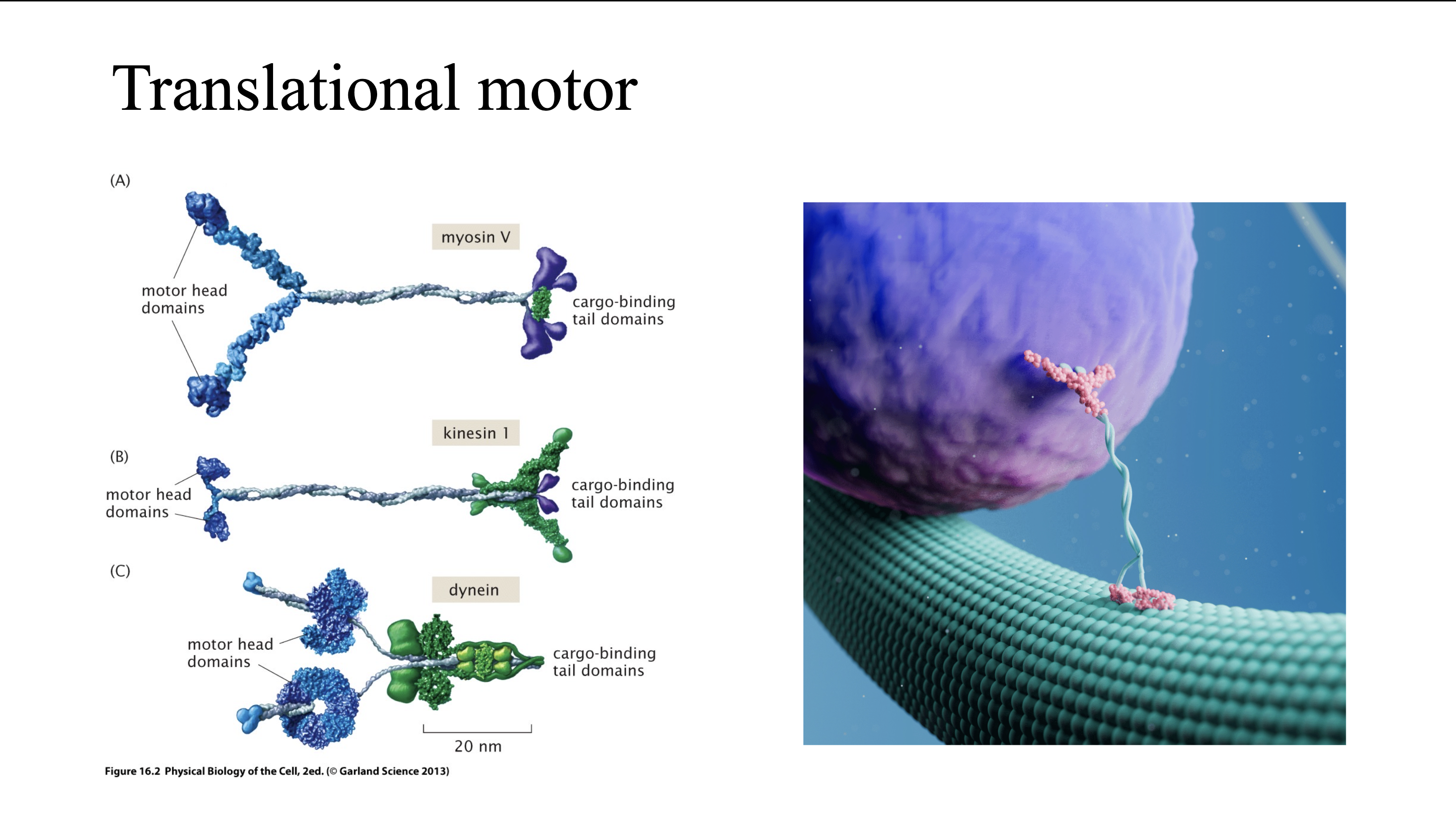 平移马达 (translational motor):需要一个轨道,分为 myosin (肌球蛋白)、kinesin (驱动蛋白) 和 dynein (动力蛋白) 等等.