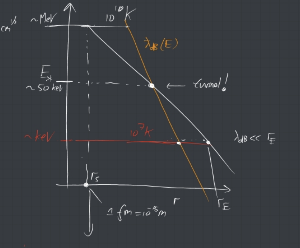 现在来计算太阳能否点火核聚变 —— 需要足够热来突破 Coulomb 势的势垒,但是这一般要 1010 K,而太阳的温度在 107 K 量级. 唯一的解释是 quantum tunneling. 我们不需要把质子之间的距离降低到 fm 的量级,只要可能隧穿即可,